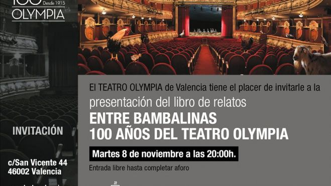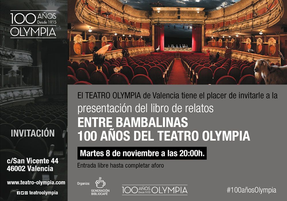 Mañana martes, 8 de noviembre, a las 20.00h, se celebrará en el Teatro Olympia la presentación del libro de relatos Entre bambalinas. 100 años del Teatro Olympia, editado junto a la Generación Bibliocafé con motivo de la celebración del 100 aniversario del teatro.