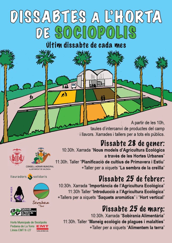 Los Dissabtes a L’Horta de Sociópolis se repetirán los últimos sábados de cada mes. Hasta marzo está previsto ofrecer a todas las personas interesadas cursillos de introducción a la agricultura ecológica y de manejo de plagas de forma sostenible, así como talleres sobre abonos ecológicos y la creación de huertos verticales.