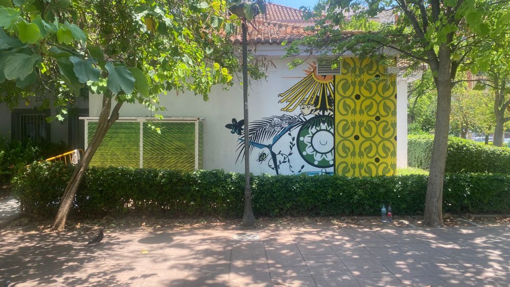 La Oficina de l’Energía, situada en el Parque del Oeste de València, ha elegido un mural artístico de gran formato que invita a reflexionar sobre el vínculo ancestral entre los elementos naturales: sol, viento y agua, y su relevancia en la transición hacia un modelo energético sostenible, colectivo y consciente.