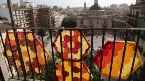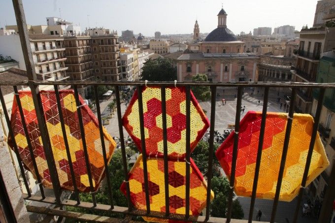 La acción, que consiste en decorar los balcones metálicos que coronan las dos torres de la sede de la Generalitat con hexágonos de lana de gran tamaño durante todo el mes de marzo, quiere simbolizar una apuesta por la presencia de las mujeres en las instituciones.