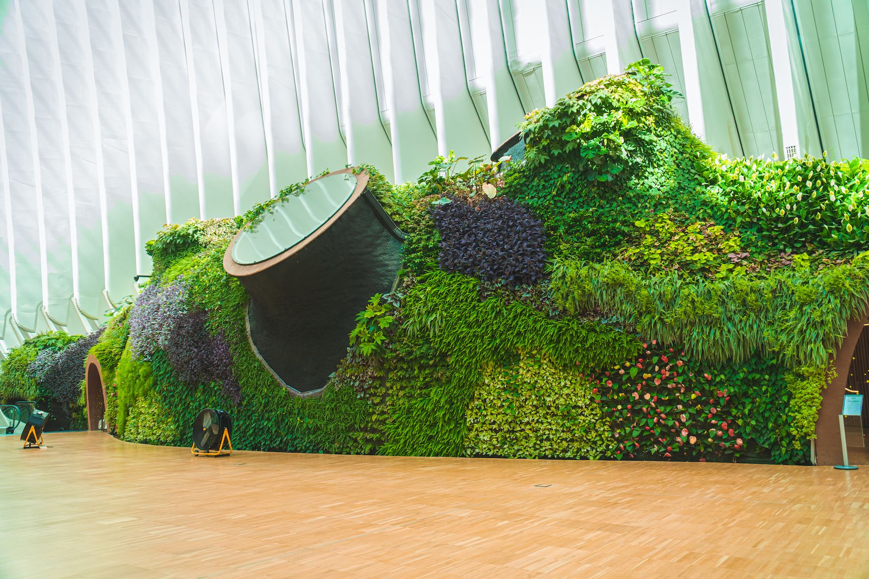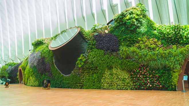 Más de 20.000 plantas conforman este jardín vertical interior de València, que ayudan a producir el oxígeno necesario para 650 personas al año. Además, como explica su creador, “este ecosistema vertical compuesto por unas 150 especies permite captar casi 84,5 kg de polvo anualmente, así como filtrar 433,31 toneladas de gases nocivos al año”.