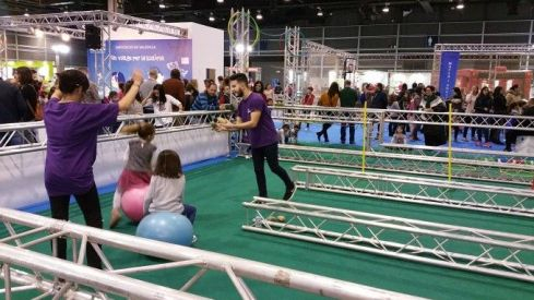 En el expositor de la Diputació se pueden practicar también diferentes deportes. El stand cuenta con un rocódromo, una zona para tirar penaltis y lanzar a canasta, camas elásticas, zona multiaventura de puentes colgantes y actividades diversas.