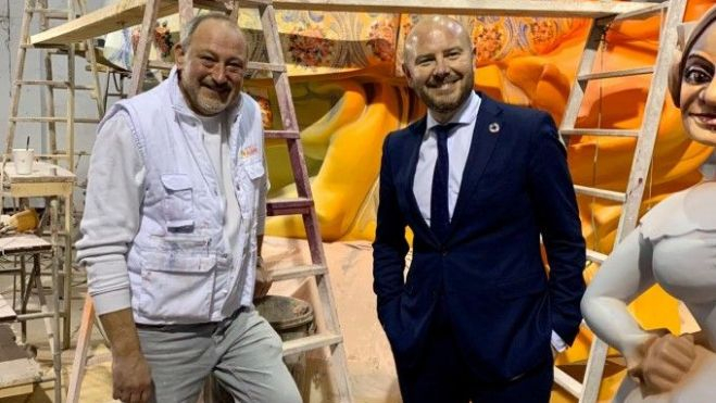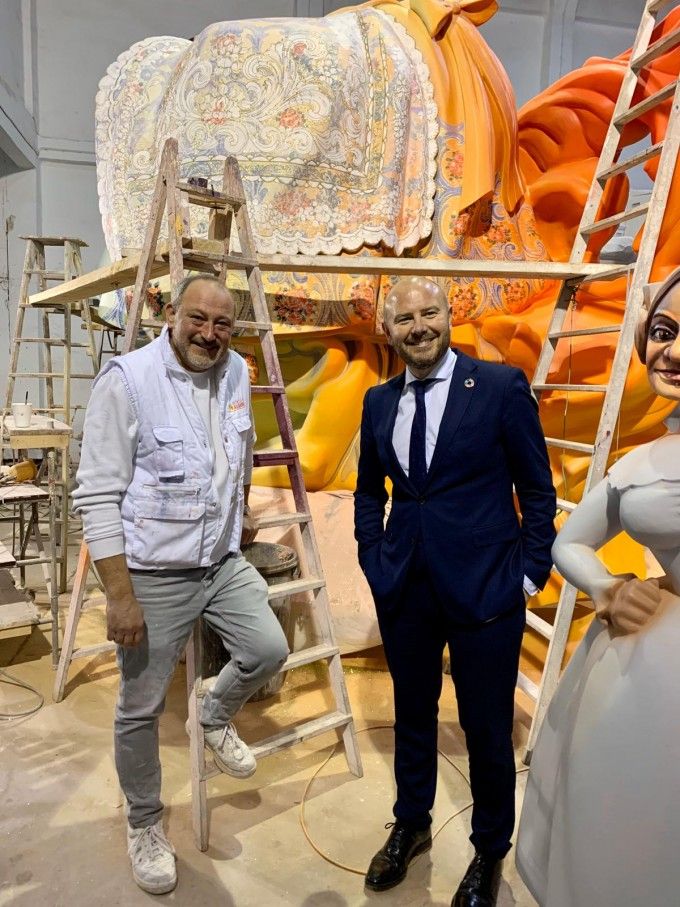 El presidente de la Diputació visitó también los talleres de Palanca y Esteve, y el de Manuel Algarra, que este año firmará los monumentos de Almirante Cadarso-Conde Altea y Maestro Gozalbo-Conde Altea, en sección Especial y 1ª A respectivamente. Algarra explicó a Toni Gaspar el discurso artístico de los monumentos que, un año más, plantará en el barrio de Russafa.