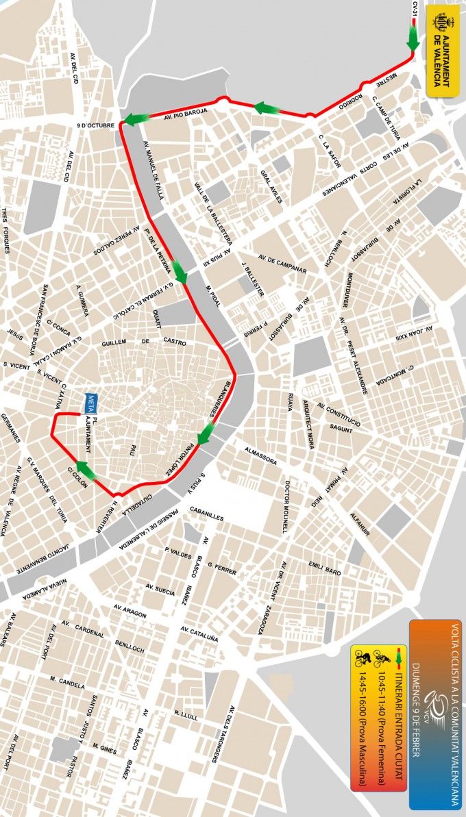 El próximo domingo 9 de febrero tendrá lugar la última etapa de la Vuelta Ciclista a la Comunidad Valenciana, tanto en categoría masculina como femenina, con salida desde Paterna y llegada a la Plaza del Ayuntamiento de València. Se estima que la prueba femenina entre en la ciudad de València entre las 10:45 y 11:40 horas, mientras que la masculina entre las 14:45 y 16:00 horas.