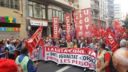 Durante la marcha, que ha arrancado a las 11.30 horas desde la plaza de San Agustín, bajo el lema 'La lluita continua, més drets, més igualtat, més cohesió', los manifestantes han reivindicado entre consignas 'que viva la lucha de la clase obrera', 'violencia es no llegar a fin de mes' o 'Jove precari, combat l'empresari' (joven precario combate al empresario).