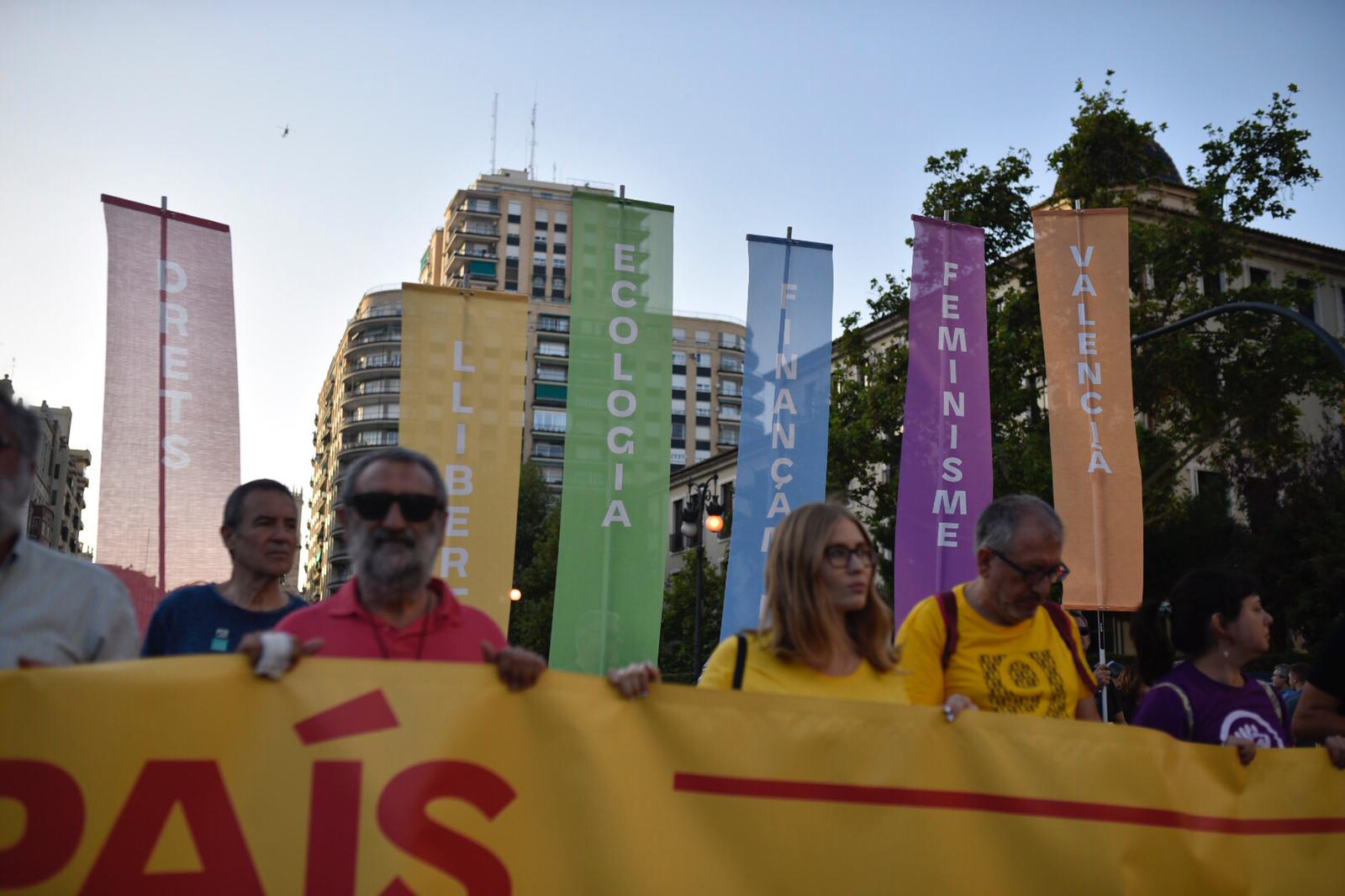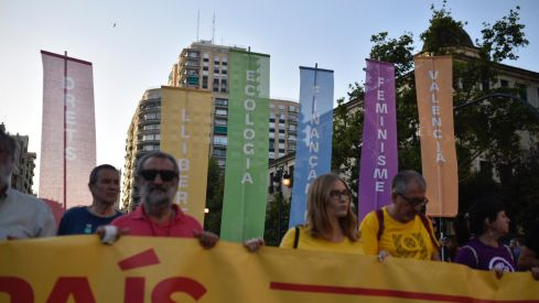 Entre las reivindicaciones y lemas también hay un ambiente festivo. Una muixeranga, frente a la primera línea, ameniza las pausas. "Visca el País Valencià!", gritan con el castell en alto. La manifestación ha atraído a un buen número de personas; una hora y 10 minutos después de su inicio, la calle Colón rebosa por su inicio y final.
