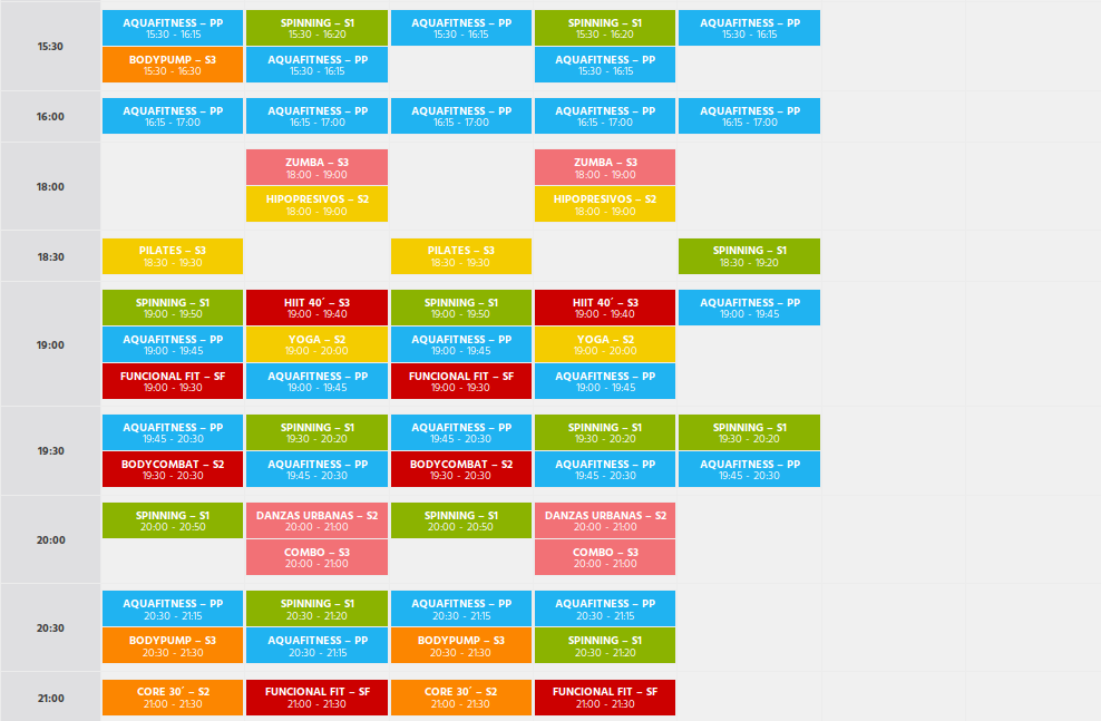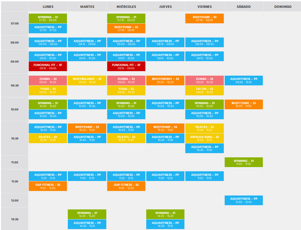 La Piscina València goza de una gran variedad de actividades tanto para adultos como para menores. Entre ellas encontramos aquacombat, bodycombat, spinning, pilates, taichi, zumba, body tonic, y kidfit, youngfit o minizumba para los más pequeños de la casa. El horario de las actividades es el siguiente: