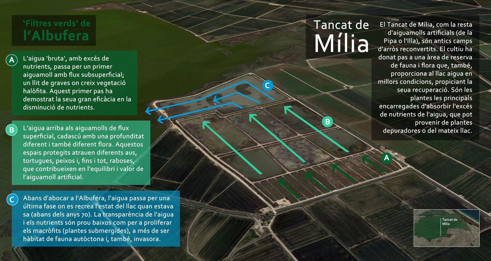 Desde la periferia del agua de la laguna, unos "Filtros Verdes" aportan su grano de arena para ayudar a la recuperación ambiental. Es el caso de los 'tancats', que filtran, mediante procesos naturales, agua de la propia Albufera o de depuradoras, para que vuelva o entre al lago con mejor calidad ecológica, es decir, con menos nutrientes y más 'cristalina'.