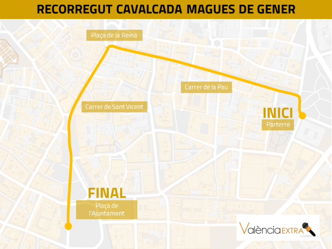 El recorrido será el mismo que el de hace un año. Empezará en el Parterre y discurrirá a través de la calle de la Paz hasta llegar a la Plaza de la Reina. Allí, tomará la calle de San Vicente hasta la Plaza del Ayuntamiento. En el consistorio las Magas de Enero serán recibidas por el alcalde de la ciudad, Joan Ribó.Esta edición contará con mayor entretenimiento a lo largo de la cabalgata. Habrá espectáculos de teatro de calle, batucadas, exhibiciones tradicionales como dolçaines i tabalets, muixarangues y gigants i cabuts, así como otro tipo de danzas. Además, siguiendo con el lema del ecologismo, se repartirán semillas de árboles en todo el recorrido.