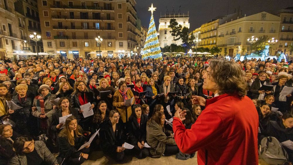 Centenares de coristas cantan villancicos al unísono en la plaza de la Virgen de València