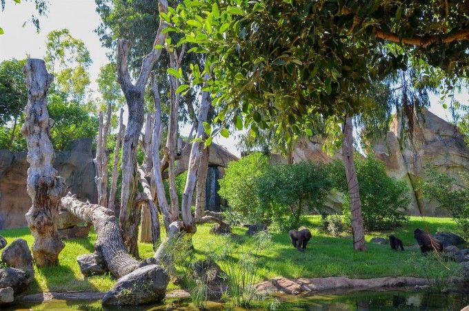 En la zona de África ecuatorial del parque habitan dos grupos de gorilas (Gorillagorillagorilla), el reproductor y el de machos "solteros". Hasta hace unos días se podía ver al primero en un recinto separado por una cascada y una ría del espacio de los chimpancés y al otro en el que linda con la playa de cocodrilos y la ría de hipopótamos.