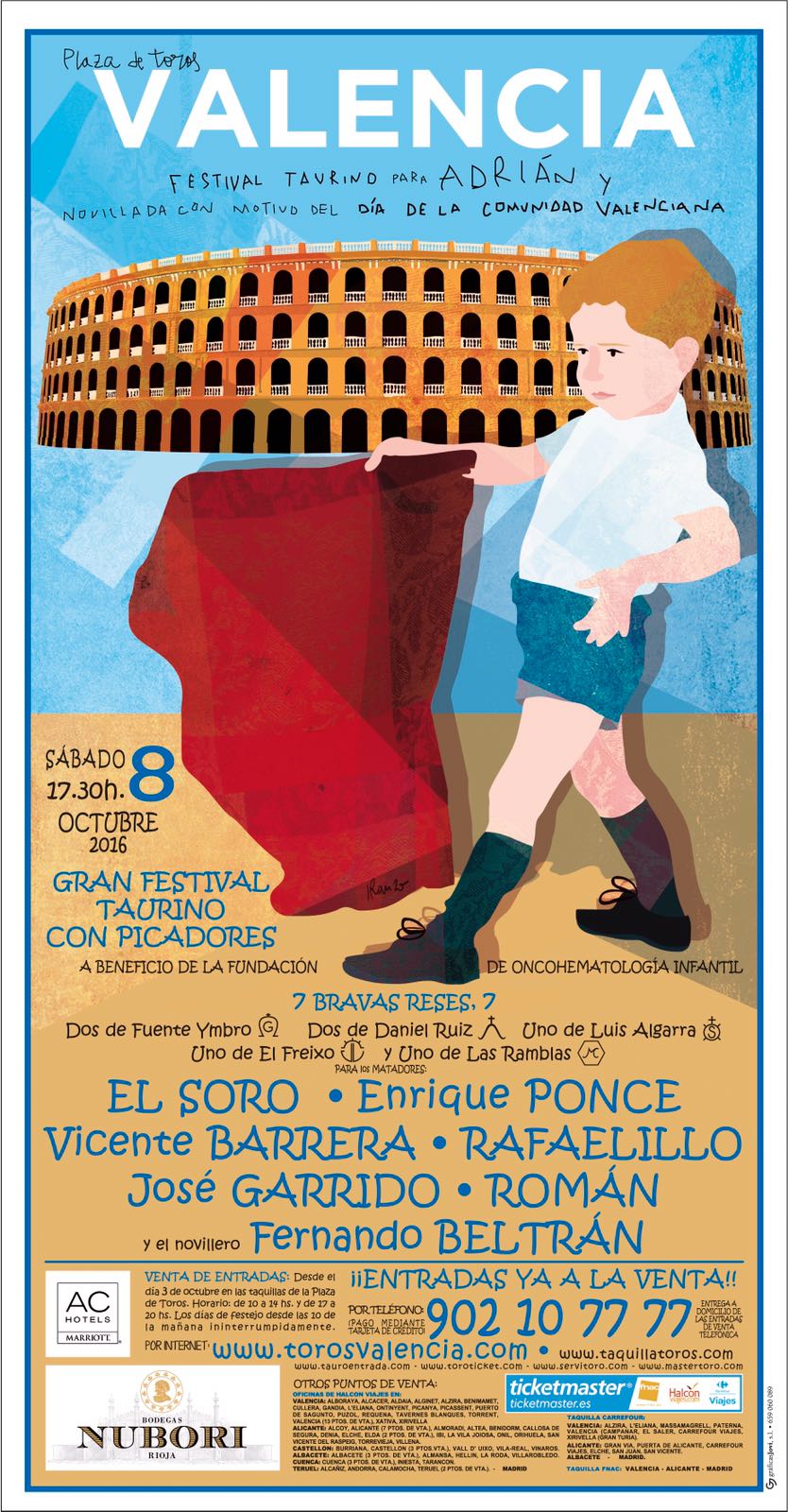 Los mejores toreros valencianos se reunirán el sábado 8 de octubre a partir de las 17:30h en la Plaza de Toros de Valencia para participar en el “Festival para Adrián”, un festival taurino en beneficio de la Fundación de Oncohematología Infantil que ayuda a niños con cáncer. Adrián es un niño de 8 años aficionado a los toros que lucha por superar un Sarcoma de Ewing, un tipo de cáncer que afecta a los tejidos blandos del cuerpo.