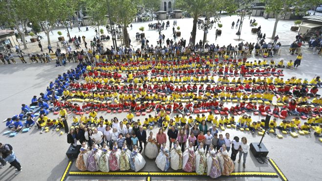 Esta actividad ha reunido a un total de 463 escolares de Infantil y Primaria y 67 docentes de estos centros municipales que han homenajeado a la Senyera, vistiendo camisetas de los colores que simulan la bandera y colocándose en el suelo dibujando sus franjas, y han ofrecido una “mascletà” ejecutada manualmente por los propios escolares con botellas de plástico y cajas de cartón a modo de instrumentos musicales que ha reproducido el sonido de los petardos.