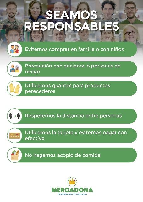 - Responsabilizarse del cumplimiento de las medidas de seguridad, como guardar la distancia mínima, respetar el aforo máximo o utilizar guantes para manipular los productos perecederos