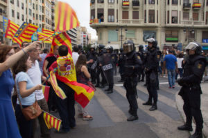 R: Yo soy miembro de Compromís. Unas cuantas personas de la corriente interna "Bloc y Pais" habíamos quedado allí. Pero yo tengo la mala suerte de llegar tarde, a las 18:15, e ir directamente a (la Plaza de) San Agustín. Mis compañeros habían salido pero yo no lo sabía. Se juntó la manifestación convocada por Acció Cultural, Intersindical, Compromís, los Iaioflautas, Podemos y otros partidos políticos; con otra manifestación convocada por la CUP y Arran, con una proclama diferente por la independencia de Cataluña.