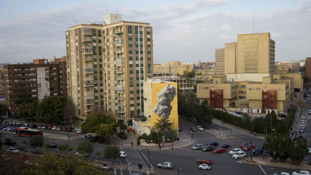 Este mural, pintado durante los últimos tres días de febrero cerca del antiguo Hospital La Fe de València, tiene como figura central una enorme nube de humo como la que podría generar un bombardeo en un contexto bélico y en sus márgenes se puede leer la frase 'La guerra comienza aquí'.