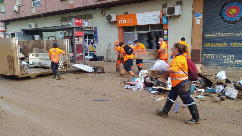 Las fachadas de las viviendas de  La Torre conservan todavía la marca del agua. La capa de barro de las calles disminuye gracias al inmenso operativo coordinado por el Ayuntamiento de València, en el que colaboran efectivos enviados por los ayuntamientos de Madrid, Zaragoza y otros municipios de España. El tránsito de los vehículos de emergencia, del Ejército, Policía, Cruz Roja, Bomberos, maquinaria pesada y agrícola y de limpieza es continuo por las calles de la pedanía y se mezcla con las columnas de voluntarios y voluntarias que atraviesan el pueblo.