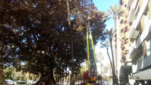 Las tareas de poda se están llevando a cabo por personal especializado, con la ayuda de una de las grúas con plataforma elevadora de mayor altura que disponen los Bomberos, ya que en estos ejemplares las ramas tienen una gran longitud y es complicado realizar las tareas de inspección y poda sin la ayuda de estos medios.