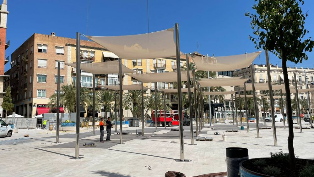 Por el momento, ya han llegado los toldos que proporcionarán sombra en la zona central de la plaza. Diseñados por Tomás Llavador-Escario, estos toldos tan solo permanecerán en la plaza de la Reina durante los meses de verano que, junto a los pulverizadores, ayudarán a combatir las altas temperaturas. Asimismo, se plantarán un total de 115 árboles – se han incrementado en un 70% – que contribuirán a generar más metros de sombra alrededor del espacio.