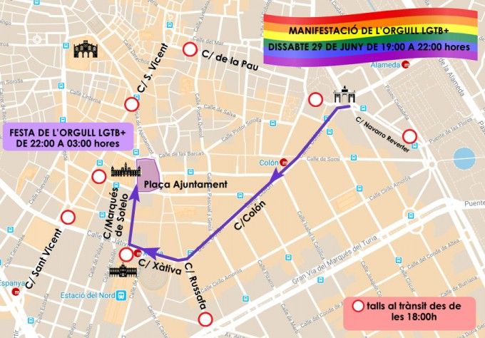 El itinerario dispuesto para la manifestación es el siguiente: Porta de la Mar, Colón, Xàtiva, avenida Marquès de Sotelo y plaza del Ayuntamiento. Para ello, el tráfico de Pintor Sorolla se desviará por la plaza Alfons el Magnànim, General Tovar y General Palanca. Por otro lado, de 22.00 a 03.00 horas de la madrugada, proseguirá la fiesta en la plaza del Ayuntamiento, la cual implicará el desvío del tránsito motorizado, en función de la ocupación, por las calles Barques, la avenida Maria Cristina, así como por la calle Sant Pau, sentido Marquès de Sotelo y Xàtiva.