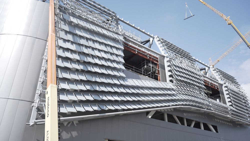 El arena, en cuyo diseño participa ERRE Arquitectura, está recubierto con una primera piel exterior diseñada para garantizar un aislamiento térmico y acústico eficientes. La segunda piel, conformada por las lamas cerámicas (suministradas por TAU Cerámica), cumple una función crucial además de la estética, ya que bloquea la incidencia directa de la luz solar, contribuyendo así a un ambiente interior más confortable.