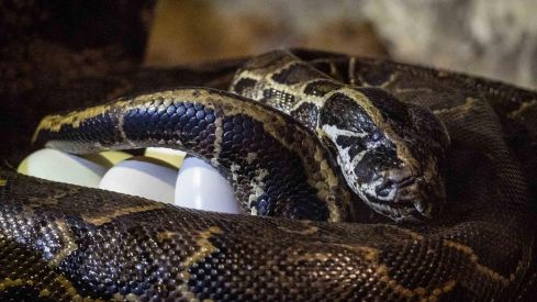 Llama la atención las características de los huevos que, con su cáscara blanda y viscosa, conforme van saliendo se adhieren entre ellos hasta crear una pirámide sobre la que se enrosca cuidadosamente la serpiente para protegerlos e incubarlos, explica Bioparc.
