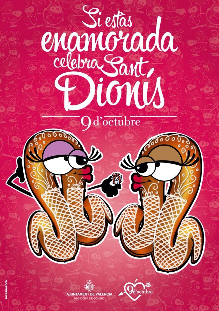A menos de dos semanas del 9 d’Octubre, fecha en que también se celebra la festividad de Sant Dionís, marcada en la ciudad de Valencia por el obsequio de dulces entre enamorados, el Ayuntamiento ha presentado la campaña gráfica de promoción de la fiesta y apoyo al pequeño comercio y los hornos tradicionales de la ciudad. Bajo el lema “Si estàs enamorat/ada celebra Sant Dionís”, la campaña se basa en cuatro carteles con el objetivo de dar apoyo a este sector comercial.