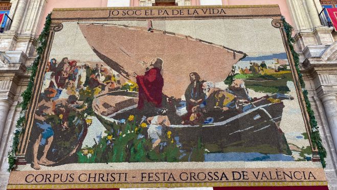 El Corpus de València 2023 ya tiene tapiz floral. En esta ocasión, se ha querido conmemorar el centenario de la muerte de Sorolla con la recreación de uno de sus cuadros. Concretamente, se trata de la obra ‘Yo soy el pan de la vida’, en el que se representa a Jesús resucitado en el lago Tiberíades. A partir de este viernes, día 9 de junio, el tapiz floral del Corpus ya se puede visitar en la plaza de la Virgen, donde permanecerá a lo largo de todo el fin de semana como parte indispensable de la ‘festa grossa’ de València.