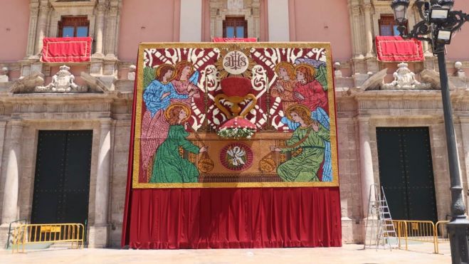 El tapiz de flores de la festividad del Corpus Christi 2024 ya luce en la plaza de la Virgen de València. Se trata de una creación floral confeccionada por la firma Decourba que ha elaborado una pieza de estilo modernista con más de 150 kilos de flores. En concreto, el tapiz, que se ha colocado frente a la Basílica de la Virgen de los Desamparados, tiene unas dimensiones de seis metros de altura y ocho de anchura y una superficie total de 48 metros cuadrados.