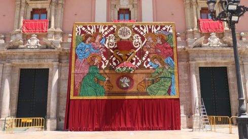 En el marco de la celebración litúrgica del Corpus, también se va a instalar en la plaza de la Reina el monumento de arte floral donde estará ubicado durante todo el fin de semana. El monumento es una reproducción de cuatro metros de altura por tres de ancho del Santo Cáliz que se venera en la catedral. Está realizado en vareta de madera, y es obra del artista fallero Juanjo García.