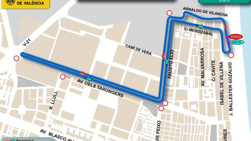 El recorrido se iniciará en la calle José Ballester Gozalvo y continuará por Isabel de Villena, Arnaldo de Vilanova, Ingeniero Fausto Elío (en sentido contrario al del tráfico motorizado), la avenida de los Naranjos (ida y vuelta por la parte más norte de la calzada –en el sentido del tráfico motorizado hacia la avenida Catalunya-), Ingeniero Fausto Elío, Mendizábal, e Isabel de Villena hasta la meta en la calle de la Font d'en Carròs.