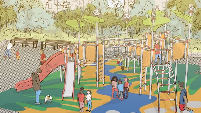 En la propuesta aprobada se crea una zona de juegos "muy llamativa y versátil" con capacidad para 74 niños y niñas de diferentes edades, puesto que posee estructuras para la escalada, puentes y toboganes. Además, se mejora la accesibilidad del espacio transformando una de las cuatro escalas en rampa.