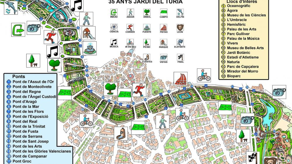 El mapa señala con ilustraciones todos los lugares de interés a lo largo del jardín, como los puentes, la Ciudad de las Artes y de las Ciencias, el museo de Bellas Artes o el parque Gulliver, hitos que tienen que ser identificados y relacionados con el número que se corresponde con cada tramo del cauce del río. El mapa ilustrado también señala los accesos adaptados, las instalaciones deportivas, las fuentes, las vistas o los lugares adecuados en los que hacer pícnic.