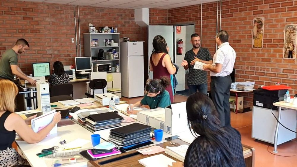 El equipo de trabajo de la empresa adjudicataria está formado por seis personas ubicadas físicamente en las instalaciones del archivo intermedio, que operan con varios ordenadores, tres escáneres de hasta DIN A3 y dos escáneres de hasta DIN A0 para planos de gran formato.