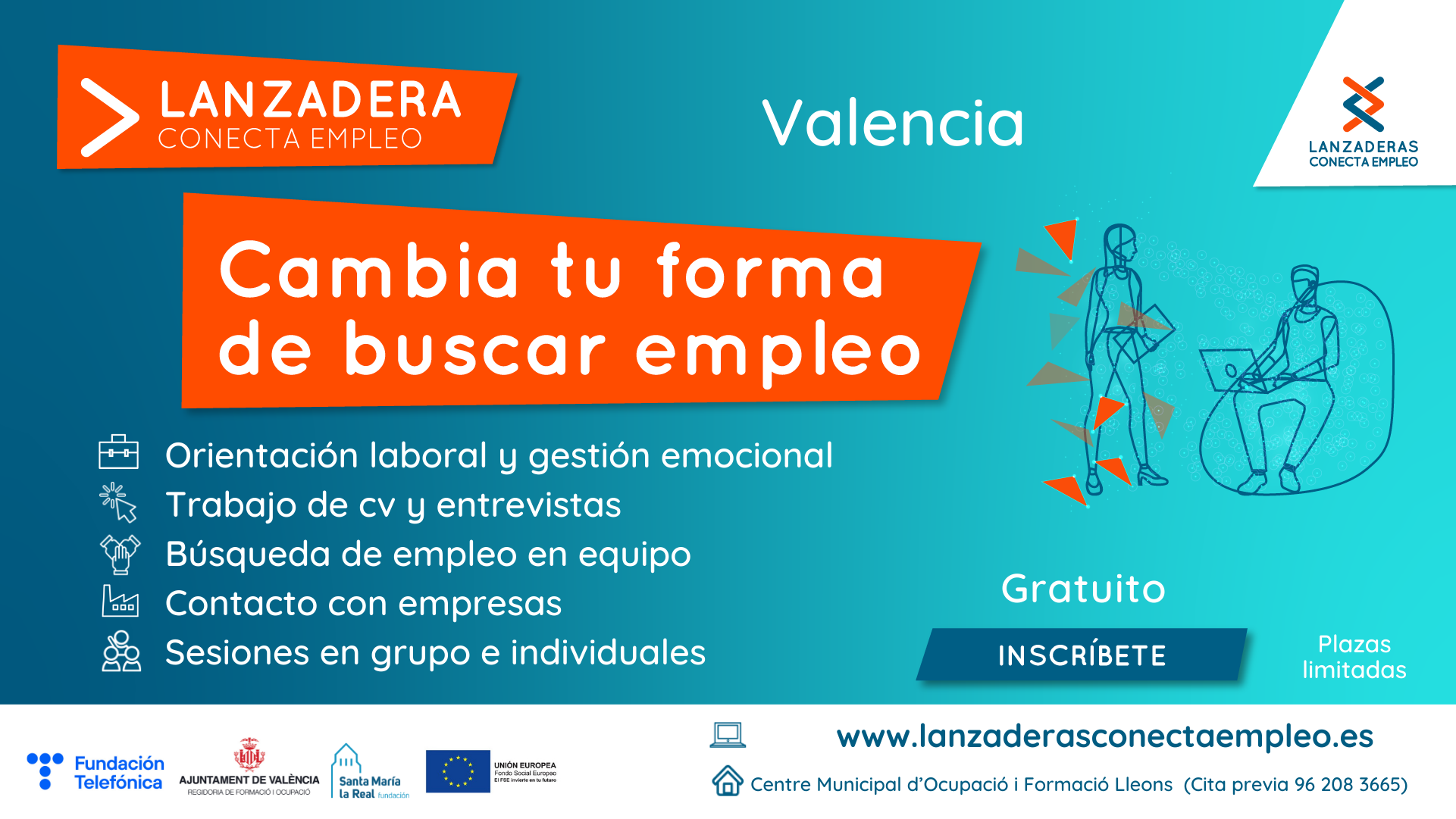 El Ayuntamiento de València ha abierto el proceso de inscripción para una nueva edición de Lanzadera Conecta Empleo, un programa gratuito para ayudar a personas en desempleo a impulsar su búsqueda de trabajo con nuevas técnicas de orientación laboral y herramientas digitales.