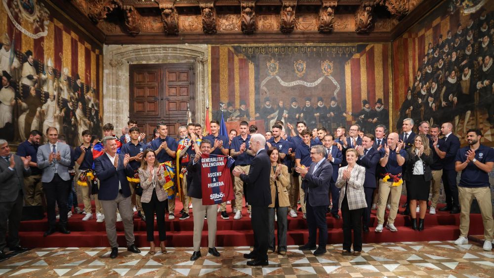 El president de la Generalitat, Carlos Mazón, ha rebut en el Palau al Levante UD després d'aconseguir el seu ascens a la Lliga EA Sports després de la victòria aconseguida ahir a Burgos.
