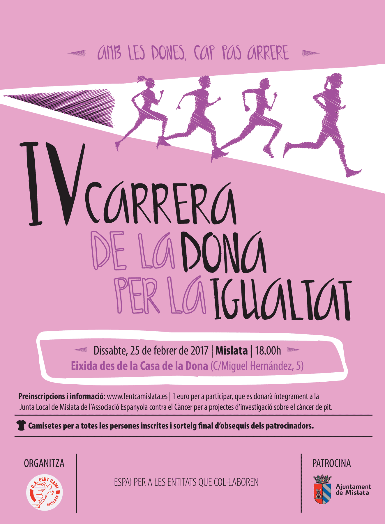 La convocatòria, que en la seua anterior edició va comptar amb mig miler de participants, es realitzarà sota la premissa d'"animar a participar tots els homes i dones que vulguen visibilitzar la lluita per la igualtat, i ací l'important no és ser el millor corredor, sinó arribar a la meta; un símil del qual la societat necessita en l'àmbit de la igualtat de gènere", segons ha explicat Carmela Lapeña, regidora de Polítiques d'Igualtat.