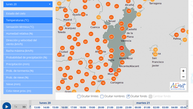 Captura d'Aemet sobre les temperatures a la Comunitat als 16h en el dia de hui