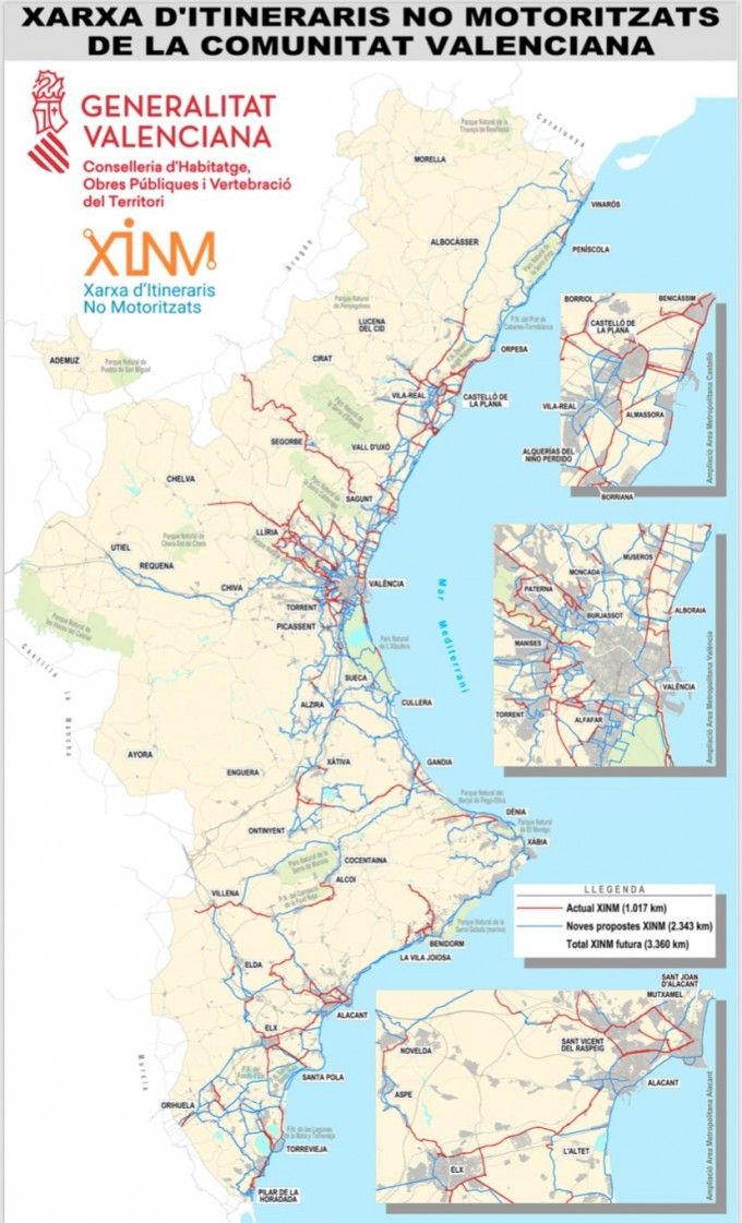 Me consta que el esfuerzo tanto del ayuntamiento de València como de la Generalitat Valenciana está siendo notable desde el inicio del cambio político en aquella primavera de 2015. Son numerosos e ilusionantes los proyectos realizados hasta la fecha pero, todavía y según parece, el asunto no ha hecho más que empezar. Hoy sin ir más lejos, desde la Conselleria de Vivienda, Obras Públicas y Vertebración del Territorio se ha presentado a distintas entidades la XINM (Xarxa d’Itineraris No Motoritzats) Un extensa red que de norte a sur y de este a oeste, dará las siguientes puntadas en la confección de una gran malla a lo largo y ancho del territorio valenciano con más de 2.300 kilómetros de itinerarios ciclo-peatonales. Impresionante y ciertamente ilusionante.