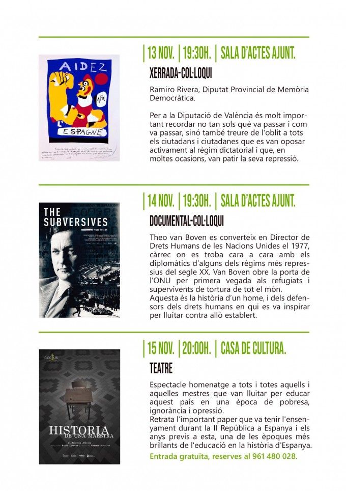 La programació s'encetarà dimecres 13 a la vesprada, a les 19.30 hores, a la sala d'actes de l'Ajuntament, amb la xerrada-col·loqui del Diputat Provincial de Memòria Democràtica Ramiro Rivera. En ella es parlarà de la importància de recordar què i com va passar, però també treure de l'oblit a aquells que es van oposar al règim dictatorial i van patir la seua repressió.