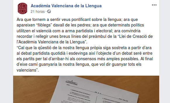 La resposta no ha tardat en arribar i, el passat dilluns, l’AVL penjava una publicació al seu compte per a referir-se als “filòlegs” que surten “davall de les pedres” i a les “veus pontificants sobre la llengua”, en referència indirecta a Català, com candidats que fan del valencià una “arma partidista i electoral”.