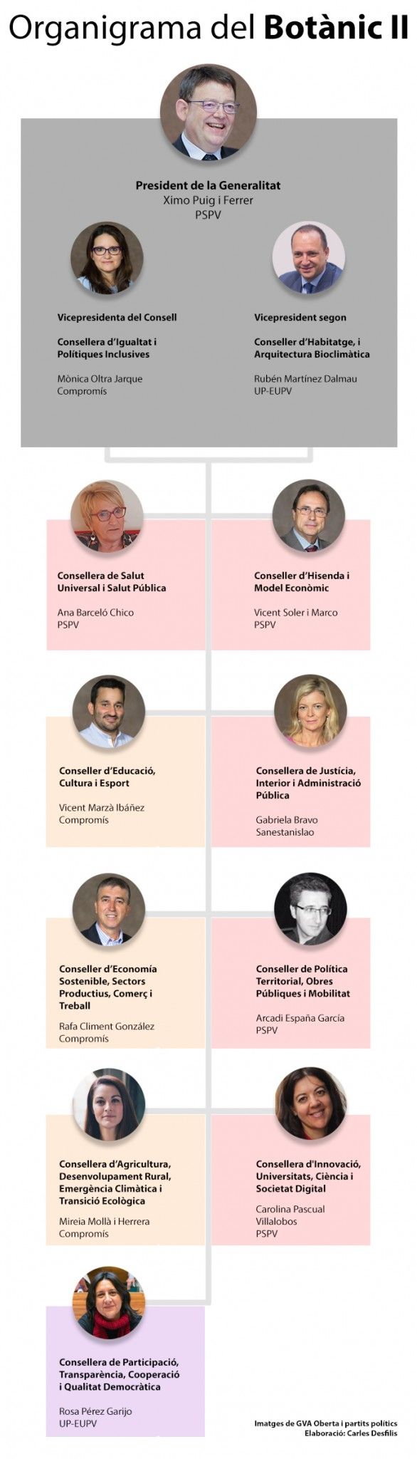 Ja és oficial. L'entorn del President ha confirmat qui seran, des de hui, els consellers del nou Botànic II. Uns noms que sorgeixen de les llargues negociacions que van portar a la reedició del govern progressista, i que s'han tancat després de la presa de possessió de Ximo Puig.