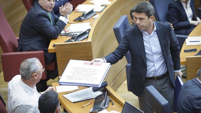El president Carlos Mazón entrega un document a Joan Baldoví en la sessió de control en Les Corts. Foto José Cuéllar