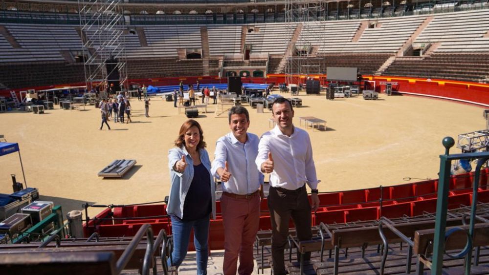 Carlos Mazón ha visitat en la plaça de bous de València el muntatge del míting central de campanya que se celebra demà, al costat de la candidata a l'alcaldia de València, María José Catalá, i el president del PP de la província de València, Vicent Mompó.