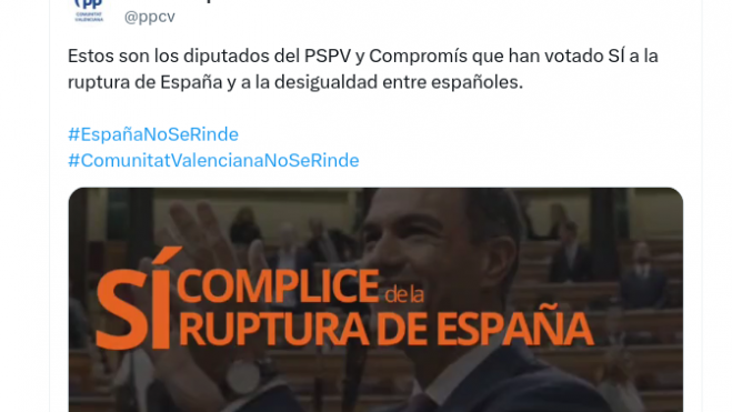 El PSPV-PSOE i Compromís denunciaran davant Fiscalia al PP per incitació a l'odi després de difondre els 'populars' un vídeo en el qual assenyalen als diputats socialistes i de Compromís-Sumar que han votat a favor de la investidura com a "còmplices de la ruptura d'Espanya".