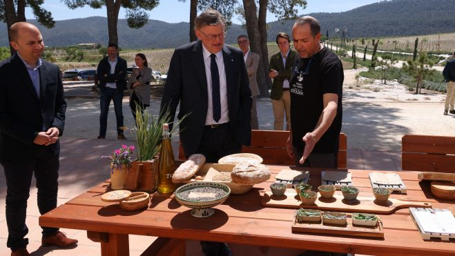 Puig ha visitat a Moixent la iniciativa de desenvolupament rural sostenible Projecte Origen, centrada en la rehabilitació de masies, la producció de cultius tradicionals com a vins i oli i l'enoturisme.