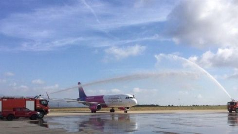 Amb motiu del primer vol, s'ha realitzat el tradicional acte de benvinguda en la plataforma de l'aeroport, on dos camions del servei de bombers han rebut a l'aeronau amb un arc d'aigua, sota el qual ha passat l'aeronau, segons ha informat la Generalitat en un comunicat. La nova ruta funcionarà dimecres i diumenge i estarà vigent fins al pròxim 15 de setembre