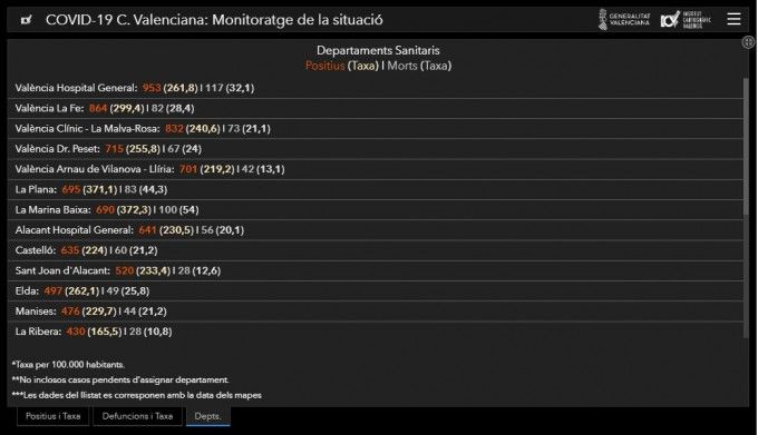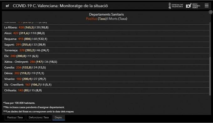 En canvi, Requena (806 casos positius per cada 100.000 habitants), la Marina Baixa (372,3 per cada 100.000), La Plana (371,1 per cada 100.000) i Alcoi (311,6) són els departaments sanitaris amb una taxa de coronavirus més alta per habitants i, per tant, serien dels últims.