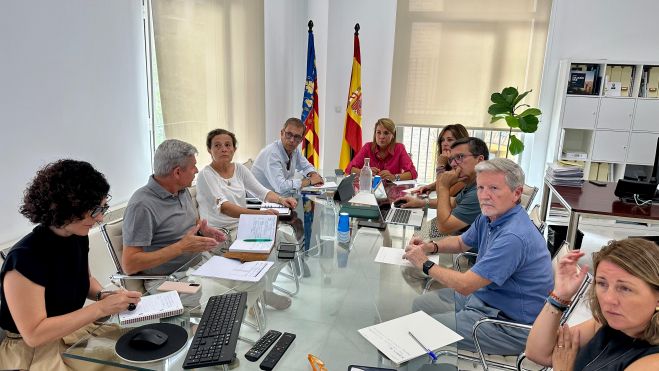 Susana Camarero, en una reunió amb el secretari autonòmic d'Habitatge, Sebastián Fernández, el director general d'Habitatge, Juan Antonio Pérez, i la directora de la EVha, Estefanía Martínez, juntament amb el seu equip directiu
