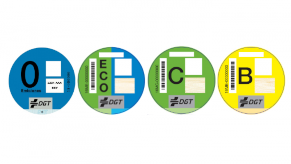 Uns distintius ambientals que classificaran els cotxes en funció del tipus de motor i de l'antiguitat del vehicle com: Etiqueta 'B' groga, Etiqueta 'C' verda, Etiqueta 'ECO' verda i blava i Etiqueta '0 emissions' blava.